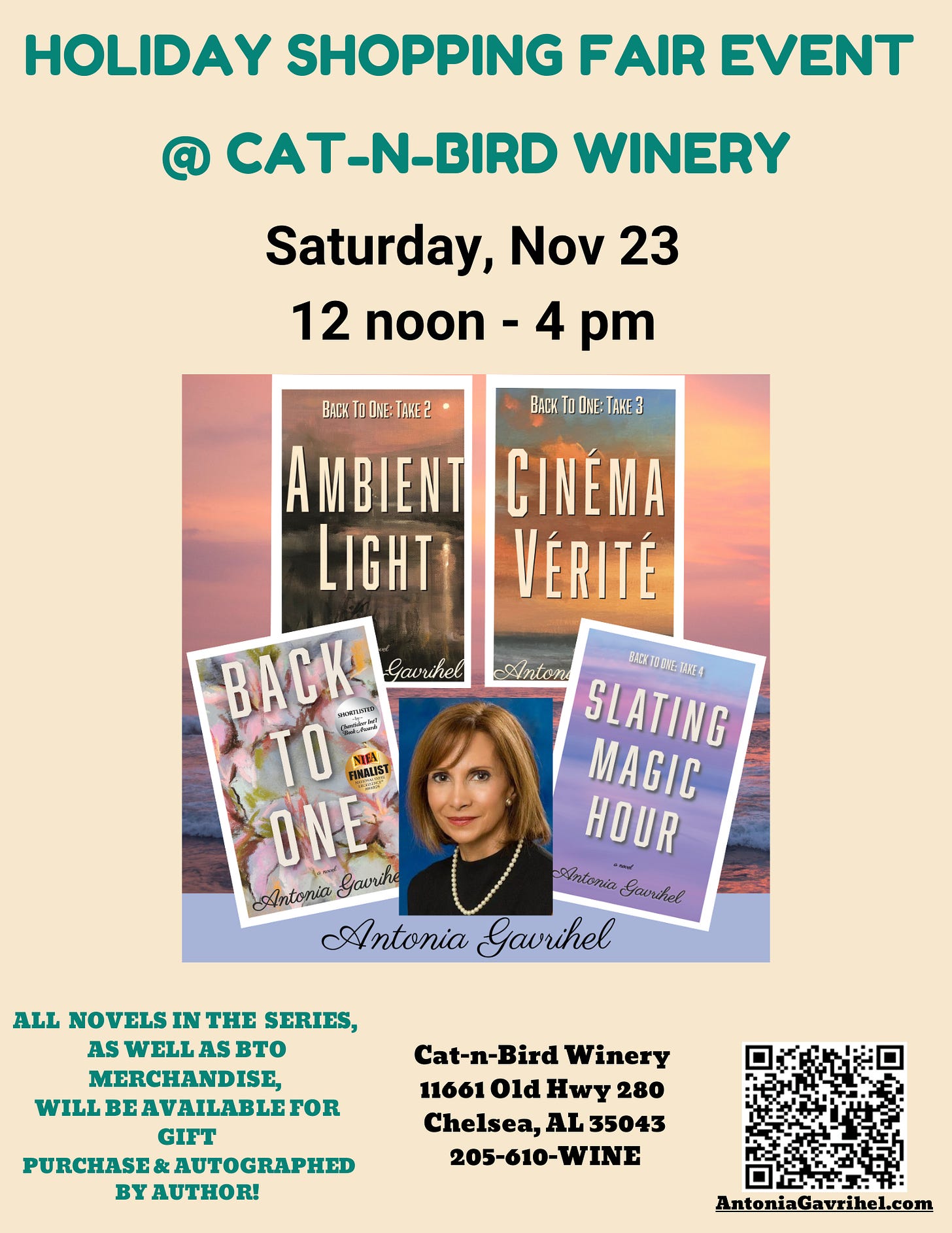 As a reminder for everyone in the Birmingham area, I will have a table signing books at Cat’ n Bird Winery off Hwy 43 and Hwy Old 280 in Chelsea on Saturday, November 23, from 12-4 pm. Have a glass of wine or refreshments, listen to great live music, and shop for gifts from various vendors at this annual holiday marketplace. All of my books will be available for purchase and autographs. I will also have fun swag, like BTO tote bags and baseball caps.
